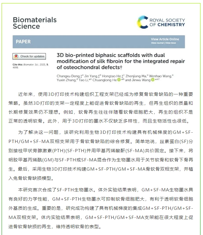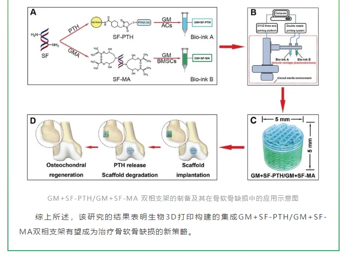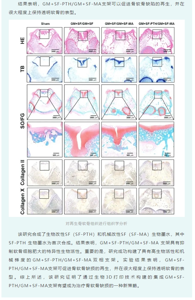科研论文分享 | 生物3D打印丝素蛋白双重修饰的双相支架,用于骨软骨缺损的综合修