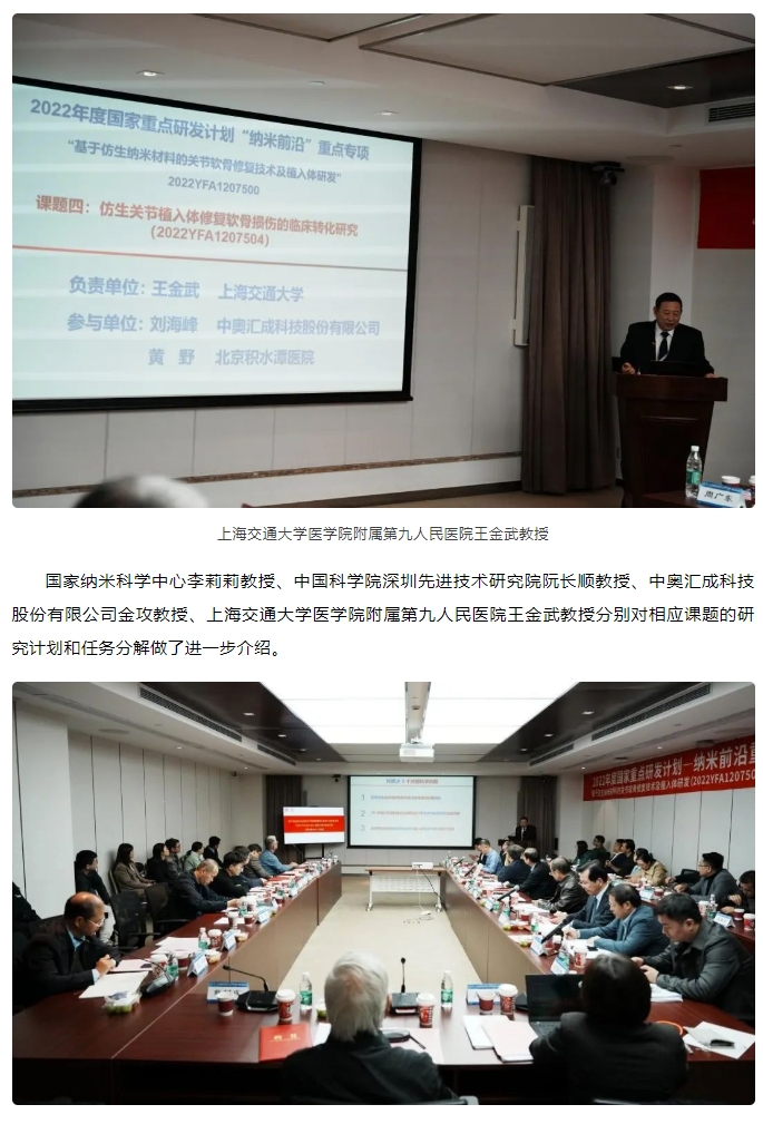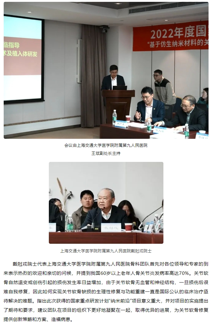 2023年11月24日,由上海交通大学医学院附属第九人民医院王金武教授牵头的国家重点研发项目—“基于仿生纳米材料的关节软骨修复技术及植入体研发(2022YFA1207500)”项目启动会暨实施方案论证会在上海交通大学医学院附属第九人民医院浦东科教园区顺利召开