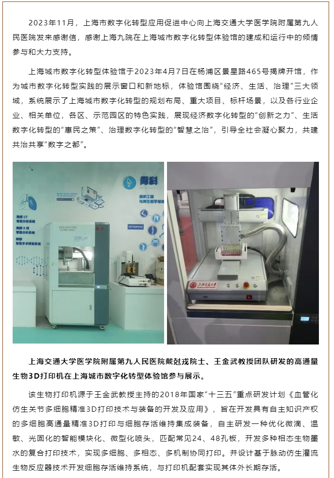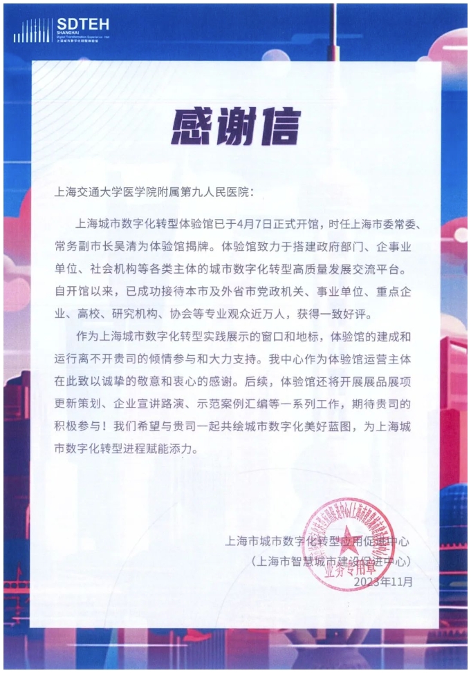 上海市城市数字化转型应用促进中心向上海交通大学医学院附属第九人民医院发来感谢信